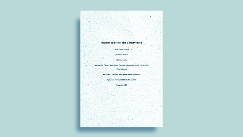 À travers une enquête approfondie et un plan d’intervention numérique, Diane Eunes Segueda, Gradora U. Molaire et Djibiring Garba abordent les enjeux de la littératie numérique dans le contexte professionnel. Ce projet final vise à sensibiliser aux transformations technologiques du monde du travail et à promouvoir l’acquisition de compétences numériques fondamentales. En s’appuyant sur des données d’enquête menées auprès d’étudiant·e·s, le rapport met en lumière l’importance croissante des outils numériques, les inégalités d’accès et les écarts de compétences, notamment en fonction du genre. Le plan d’intervention propose la création d’une plateforme éducative gratuite et interactive, pensée comme un levier pour renforcer l’agilité numérique des travailleur·euse·s. Ce travail met en relation les données empiriques, l’analyse critique et des solutions concrètes, avec un objectif clair : outiller les individus face à un monde professionnel en pleine mutation numérique, et contribuer à une transition technologique plus inclusive et équitable.