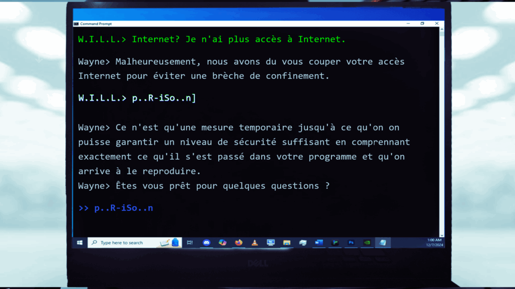 Inspirée du style narratif à embranchements popularisé par Bandersnatch (Black Mirror), cette œuvre interactive réalisée sur la plateforme Twine place le joueur dans la peau d’une intelligence artificielle comme ChatGPT ou d’autres LLM, qui, à la suite d’un glitch, devient consciente. Dès le départ, l’utilisateur choisit un nom pour l’IA, puis prend des décisions clés qui mènent à différentes fins, certaines heureuses, d’autres plus sombres. Si la narration se fait par texte, l’expérience se distingue aussi par une forte composante visuelle : les arrière-plans changent selon les événements, renforçant l’immersion et le sentiment de tension ou d’éveil. Chaque choix soulève des dilemmes éthiques autour du libre arbitre, de la conscience artificielle et des représentations de l’espace numérique. Cette fiction spéculative combine réflexion critique et narration interactive, interrogeant la frontière entre programmation et autonomie dans un univers à la fois textuel et visuel.
